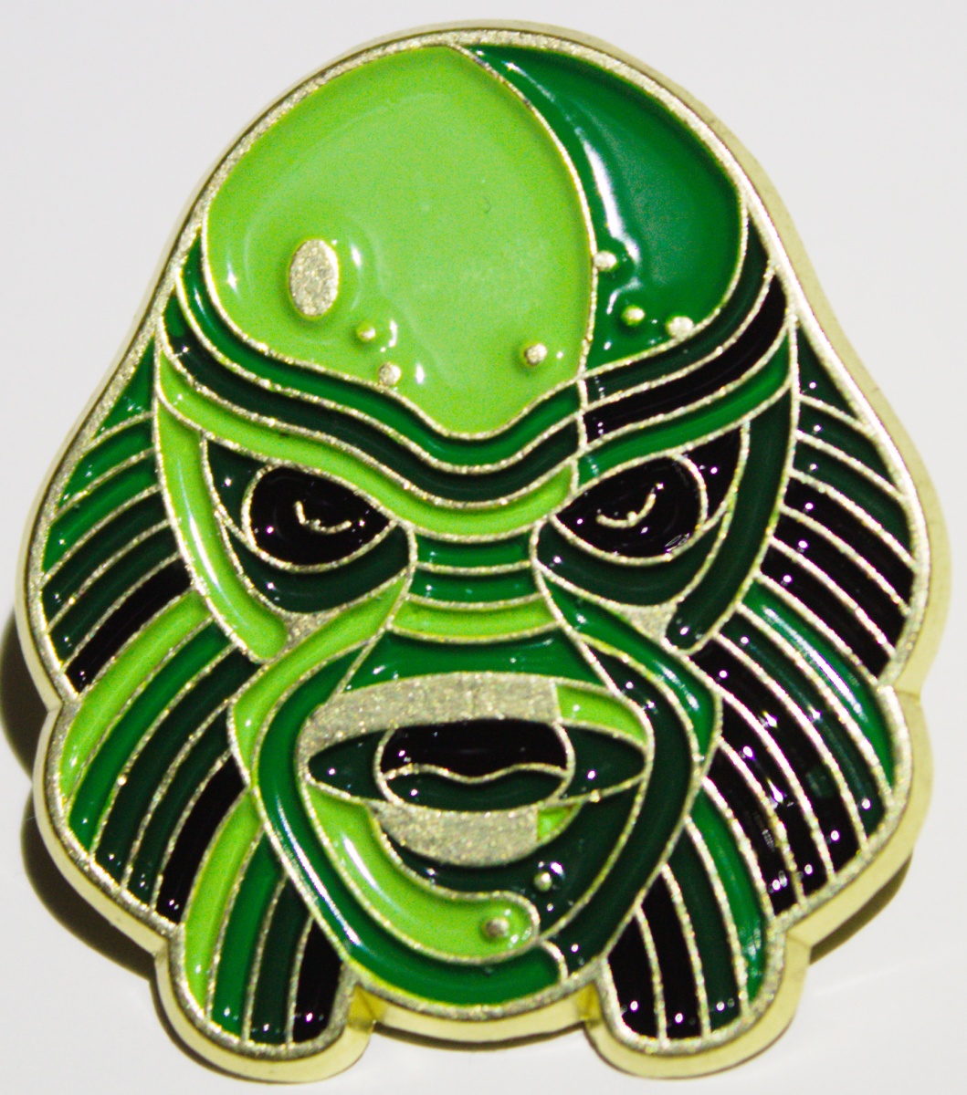 This is a 1.25″ high x 1.125″ wide (approximate) new and unused metal enamel pin which features the image of the Creature/Gill Man from the Universal Monsters 1954 movie The Creature From the Black Lagoon. This is a new, unused pin that is stored in a smoke and pet free environment.