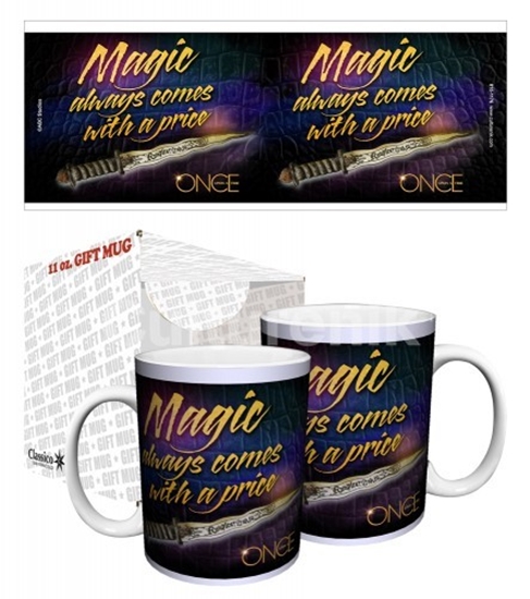 This is an 11 oz ceramic coffee mug featuring the phrase “Magic Comes With A Price” above the image of the dagger with Rumplestiltskins name on it from the popular fantasy TV show Once Upon A Time. It is a new and unused mug that ships in an illustrated box and is stored in a smoke and pet free environment.