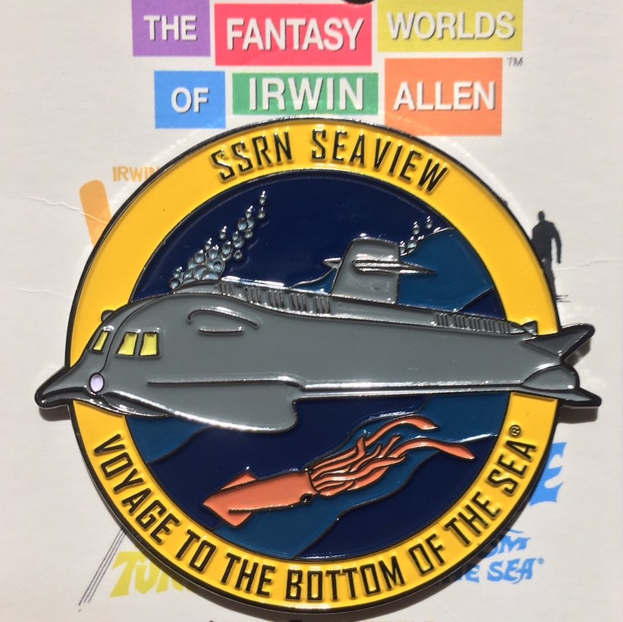 This mint, unused licensed metal enamel die-cut pin in relief features the S.S.R.N. Seaview submarine from the hit sci-fi TV series Voyage to the Bottom of the Sea. It measures 2.25″ wide x 2″ high and has been stored in a smoke and pet free environment. This is the first in a series of licensed pins paying tribute to the Fantastic World of Irwin Allen.