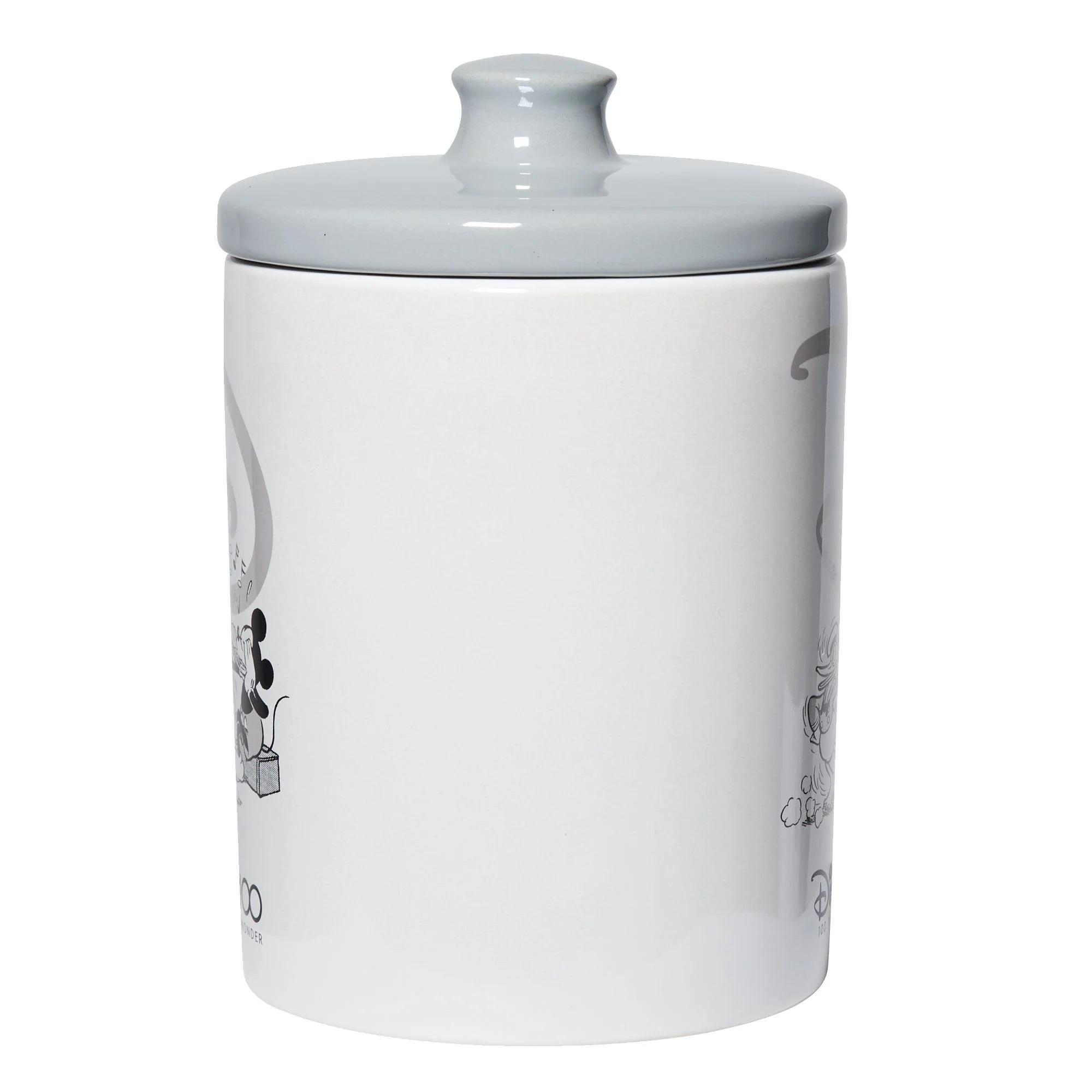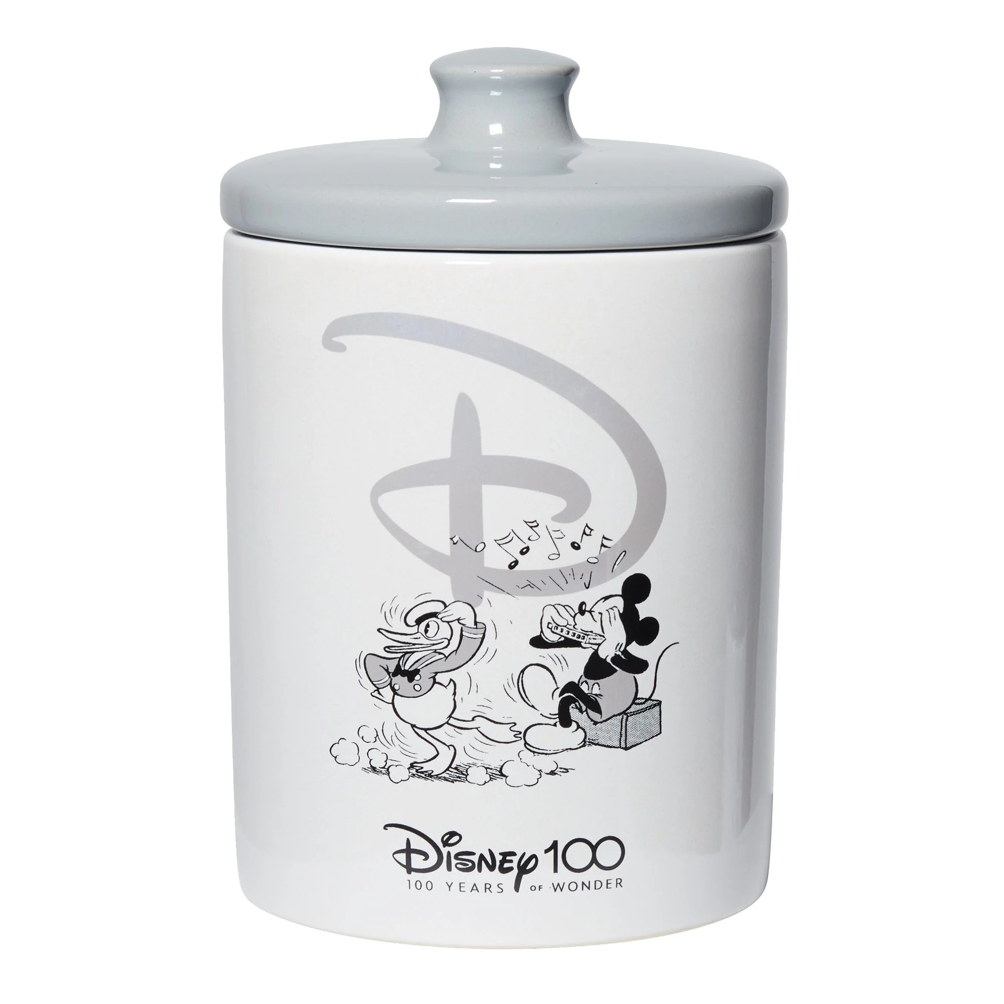 Join us in celebrating the past, present and future of Disney 100 Years of Wonder in the 2023 Centennial year with this commemorative collection designed and created by Enesco Studios especially for this most magical milestone. This is a new and unused canister cookie jar featuring the large Disney D logo above the classic images of Donald Duck and Mickey Mouse. It measures 7.5″ tall, is made from durable Stoneware Ceramic with a silicone seal to hold in freshness. This comes in an illustrated box for display and is stored in a smoke and pet free environment.