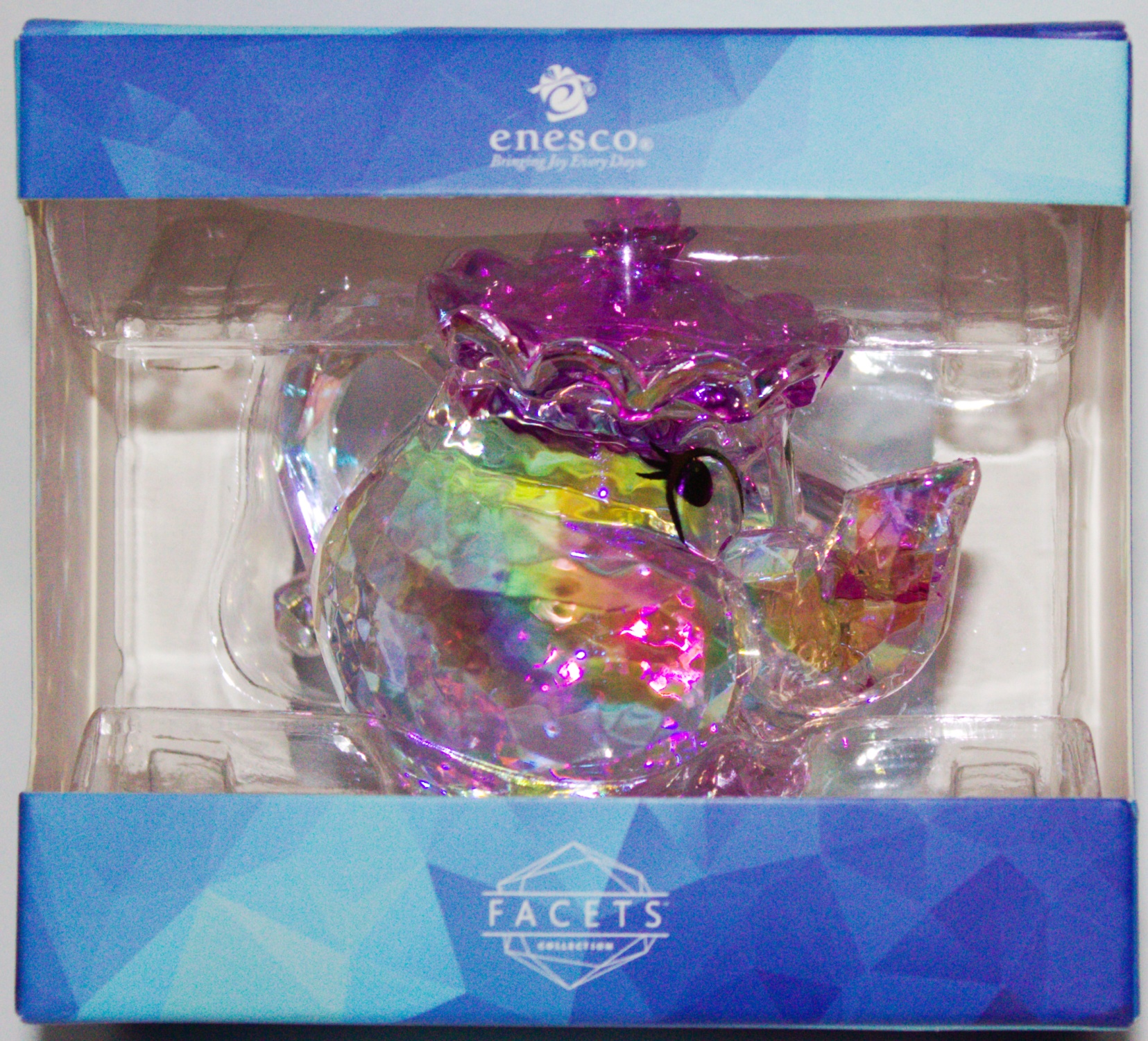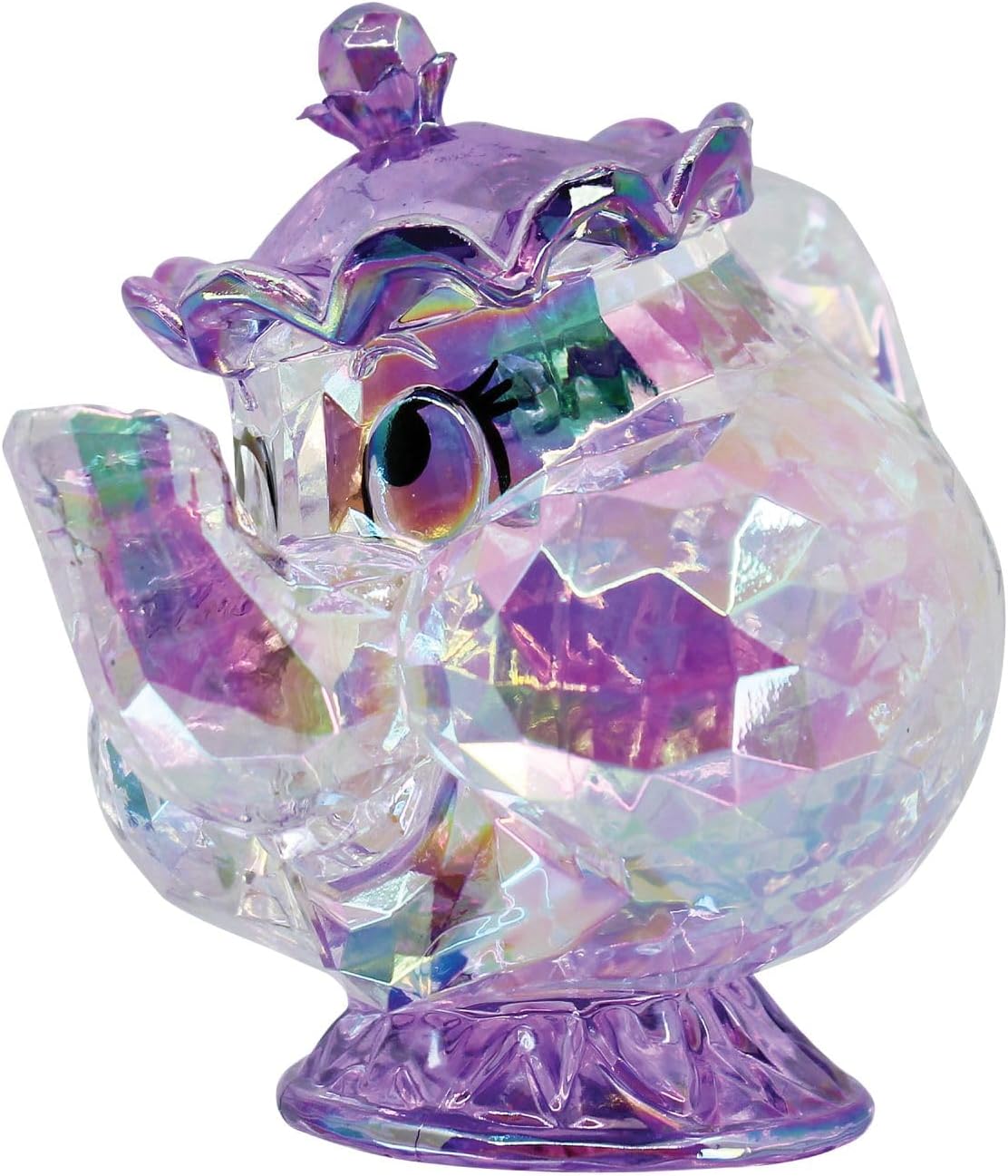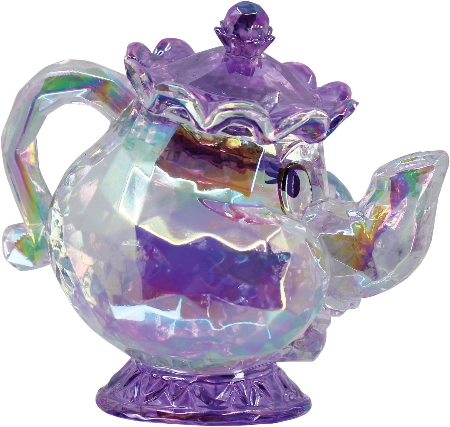 This a 2.28″ L x 3.15″ W x 2.84″ H FACETS figurine that depicts a smiling Mrs. Potts from the Walt Disney animated movie Beauty and The Beast. This crafted from high-quality acrylic material with a faceted surface reminiscent of finely cut glass or gemstone, with a brilliant refraction of light in a kaleidoscope of color. Place this over a light source to fully appreciate the the faceted rainbow of lights passing through the figurine. It is new and unused, ships in an illustrated box and is stored in a smoke and pet free environment.