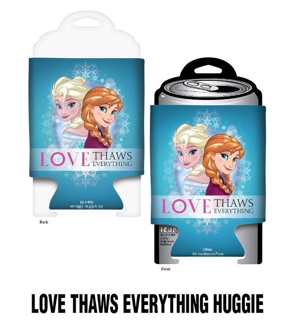 This is an insulated neoprene drink can cooler, huggie koozie featuring the image of Anna and Elsa from the hit Walt Disney movie Frozen, above the words “Love Thaws Everything”. It is a new and unused licensed can cooler stored in a smoke and pet free environment.