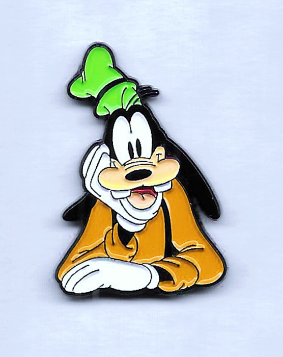 This is a 1.375″ high x 1″ wide colored metal enamel pin in the image of Walt Disney’s Goofy relaxing. This is a new unused pin still in its original packaging with a single clutch pin style back, stored in a smoke and pet free environment.