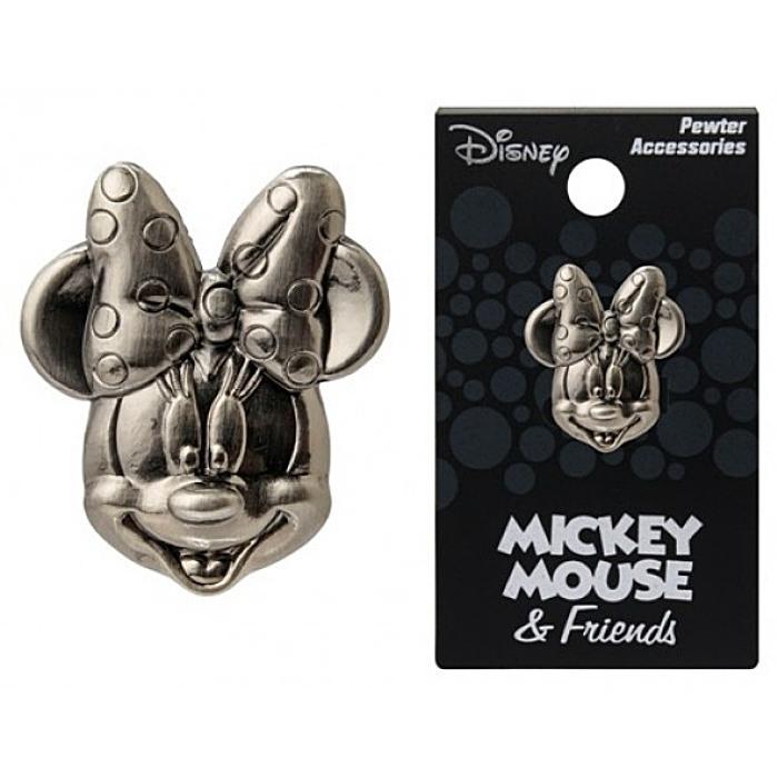 This is a licensed .875″ high grey/silver metal pewter 3-D pin in the shape of the head of Walt Disney’s Minnie Mouse. This is a new unused pin still in its original packaging with a safety pin style back, stored in a smoke and pet free environment.