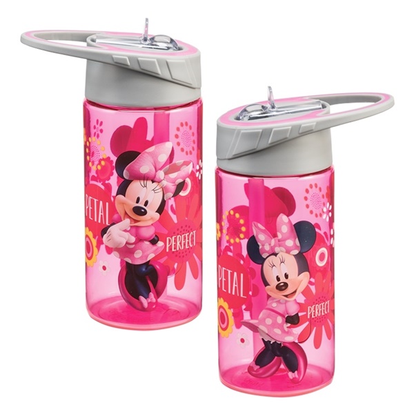 This is a clear 14 ounce double wall Eastman Tritan water bottle featuring a wrap-around design of animation art images of Walt Disney’s Minnie Mouse with the words “Petal Perfect” on the side. This water bottle is new, unused, with a photo quality design, It is made from Durable Eastman Tritan™ Plastic, Shatter Proof, Wide Mouth for Easy Filling and Cleaning, Spill-Proof Sport Lid with Straw, and is stored in a smoke and pet free environment.