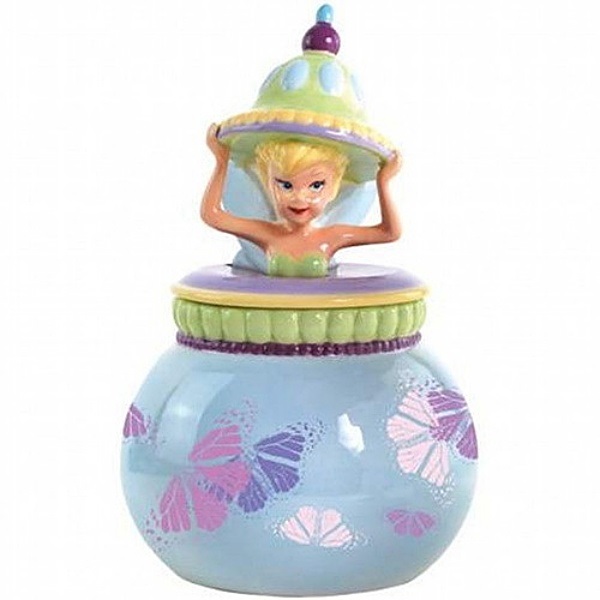 This is a 10.5″ tall ceramic cookie jar that features Tinker Bell popping out of a jar from the hit animated movie Peter Pan. It is new and unused and ships in an illustrated box. No longer being made, it has been stored in a smoke and pet free environment.