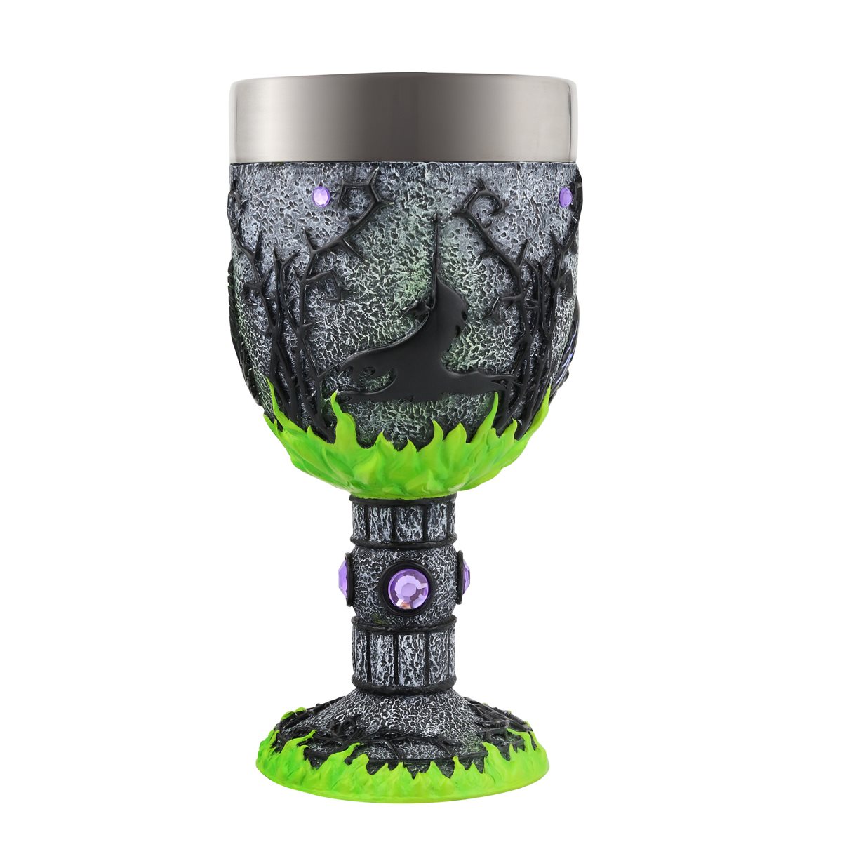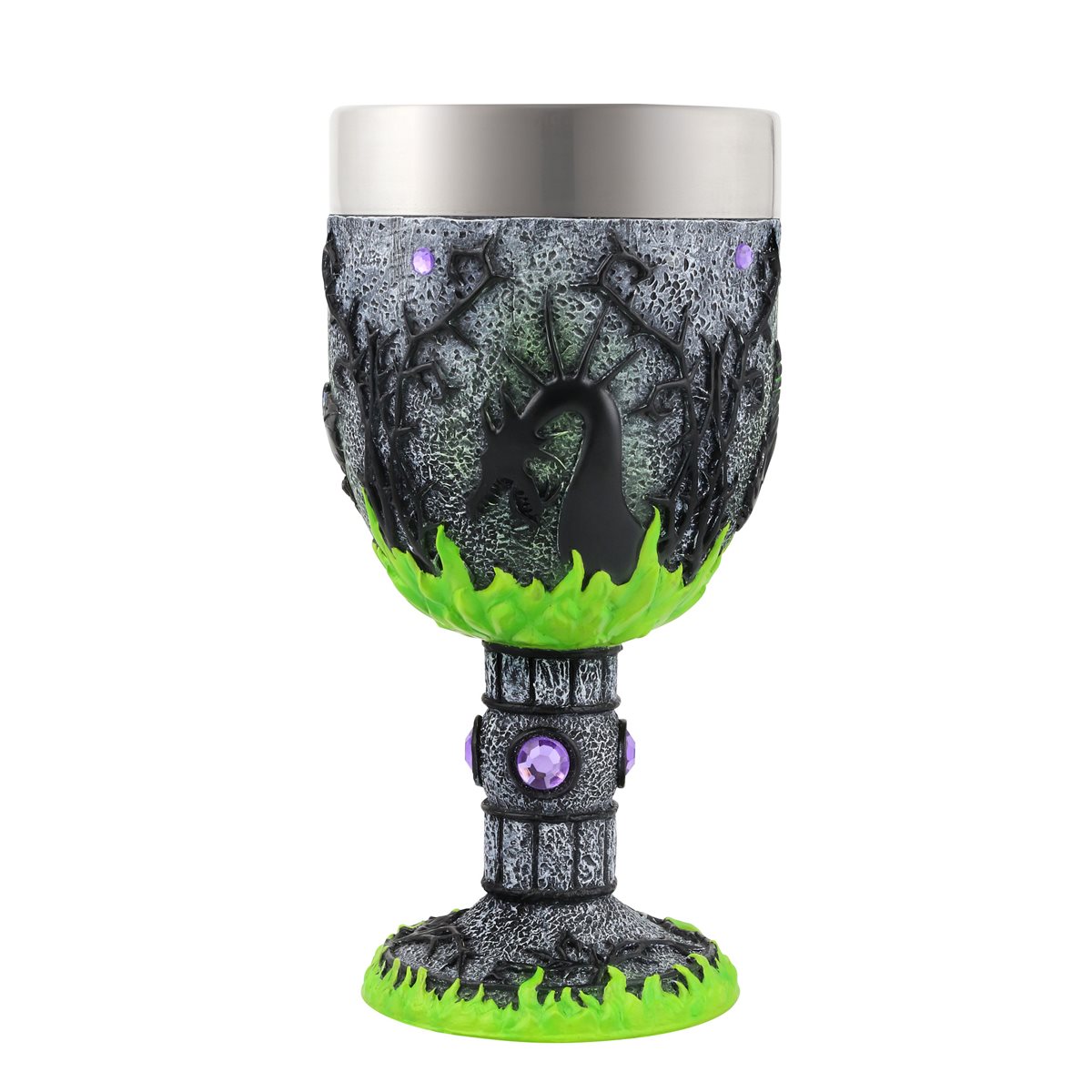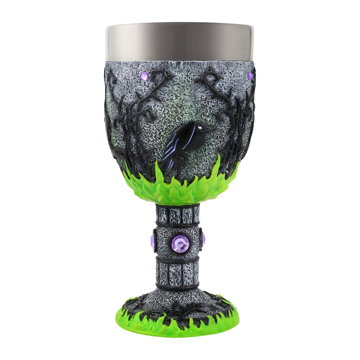 This is a 7.1″ high x 3.64″ x 3.65″ sculpted stone resin with stainless steel bowl and lip decorative goblet/chalice. Inspired by Walt Disney’s 1959 animated film Sleeping Beauty, this magnificent Maleficent stainless steel lined decorative chalice is fit for royalty. Adorned with 12 violet faux gems and 4 decaled “stained glass” vignettes this unique collectible highlights the magic and majesty of the Mistress of Evil. This is a decorative Goblet, not Intended as Drinkware, and is hand crafted in stone resin and hand painted by skilled artisans. Hand-wash stainless steel bowl only. It is new and unused and is stored in a smoke and pet free environment.