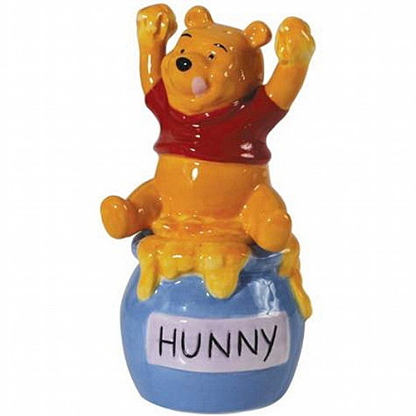 This is a 5″ tall set of ceramic salt and pepper shakers in the image of Walt Disney’s Winnie the Pooh sitting on his hunny pot from the hit animated movie Winnie the Pooh. It is new, unused and ships in an illustrated box. No longer being made, it has been stored in a smoke and pet free environment.