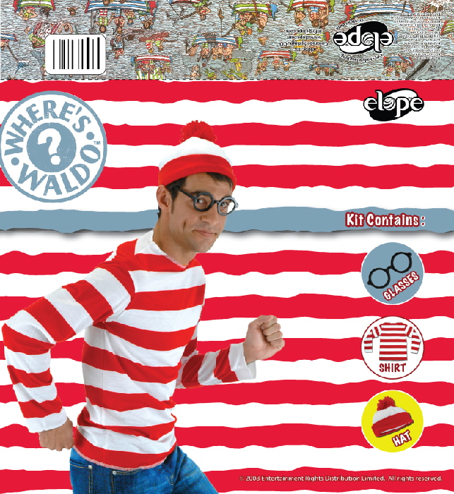 This is a costume kit for Where’s Waldo which features his shirt, hat and glasses. It is a unisex adult costume for sizes small/medium and is a new, unused kit, still in its original sealed plastic display bag. This is stored in a smoke and pet free environment.