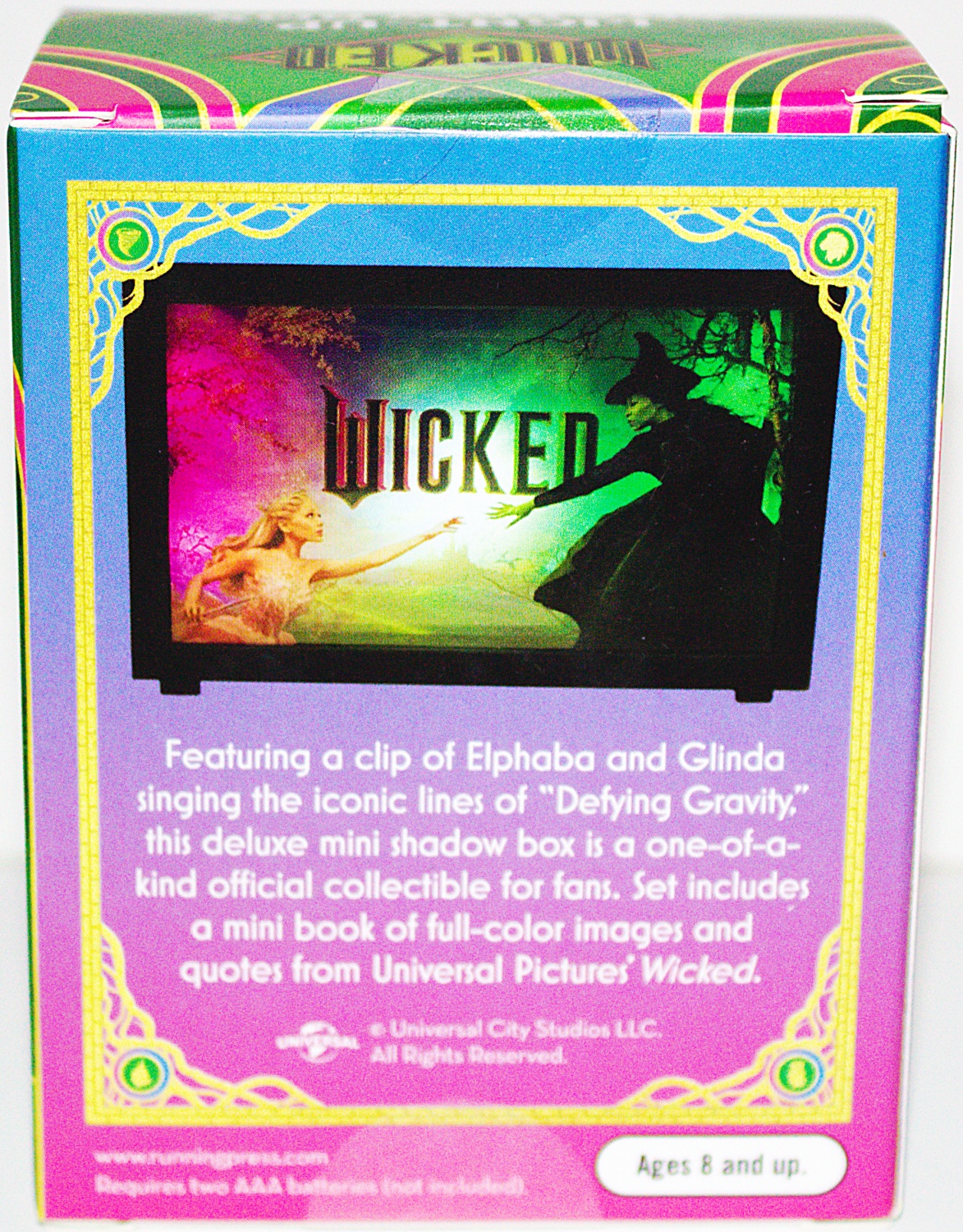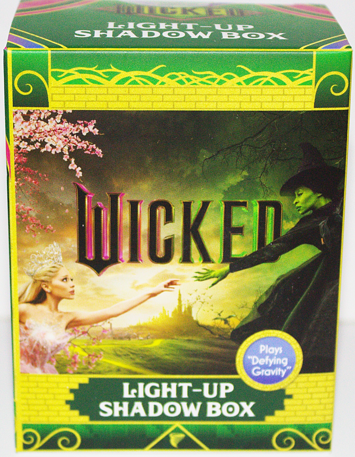 Defy Gravity with this officially licensed Wicked miniature shadow box that brings the gorgeous film poster to life, perfect to display your love for the musical anywhere! This includes a 3-inch mini shadow box of the Wicked film poster artwork and an enclosed book. The shadow box lights up to display the artwork and plays a clip of Defying Gravity, the popular song from the movie musical with Glinda’s and Elphaba’s vocals. The set also includes a mini book of full-color images and quotes from the Wicked film. This is a new, sealed copy that we purchased direct from the publisher and it has been stored in a smoke and pet free environment.