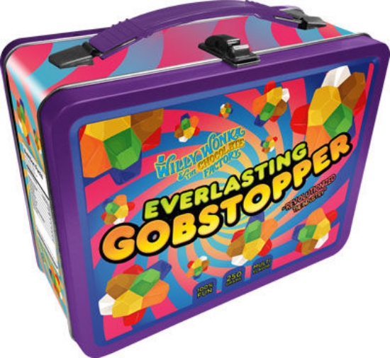 This is 7.75″ x 6.75″ x 4″ metal tin tote or lunchbox featuring an image and name logo of an Everlasting Gobstopper from the hit cult movie Willie Wonka and the Chocolate Factory. It features full-color words and images along the sides and on the front, which is embossed. It is a new, unused tin tote/lunchbox with a collapsible plastic handle and metal latch closure, stored in a smoke and pet free environment.