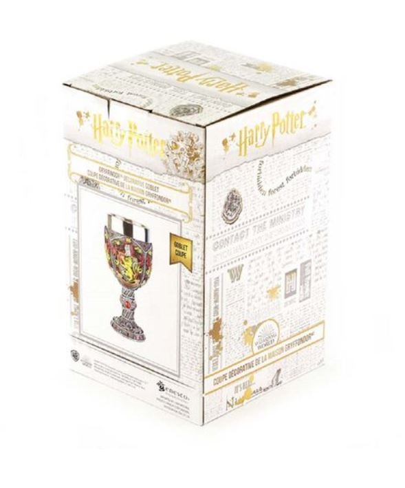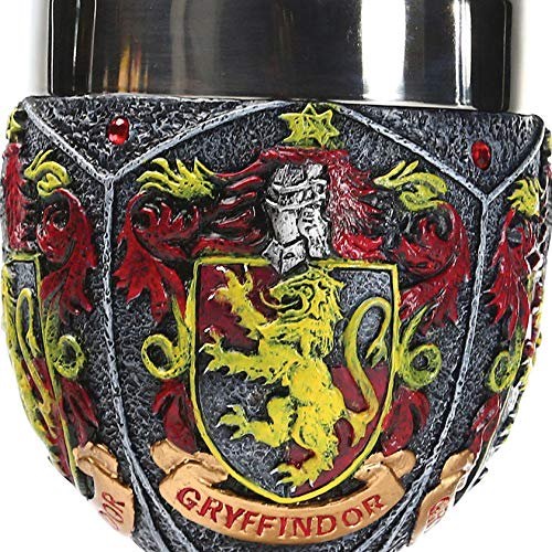 This is a 7.09″ high x 3.64″ x 3.65″ sculpted stone resin with stainless steel bowl and lip decorative goblet. Symbolized by the lion, Godric Gryffindor valued bravery and honor, and his house claimed some of the greatest witches and wizards of all time, including Harry Potter and Albus Dumbledore. Show your house loyalty with this elegant 10 oz decor goblet. This is hand-painted with clear faceted faux gemstones and featuring the Gryffindor heraldic emblem in bas relief. This is a decorative Goblet, not Intended as Drinkware. Hand-wash stainless steel bowl only. It is new and unused and is stored in a smoke and pet free environment.