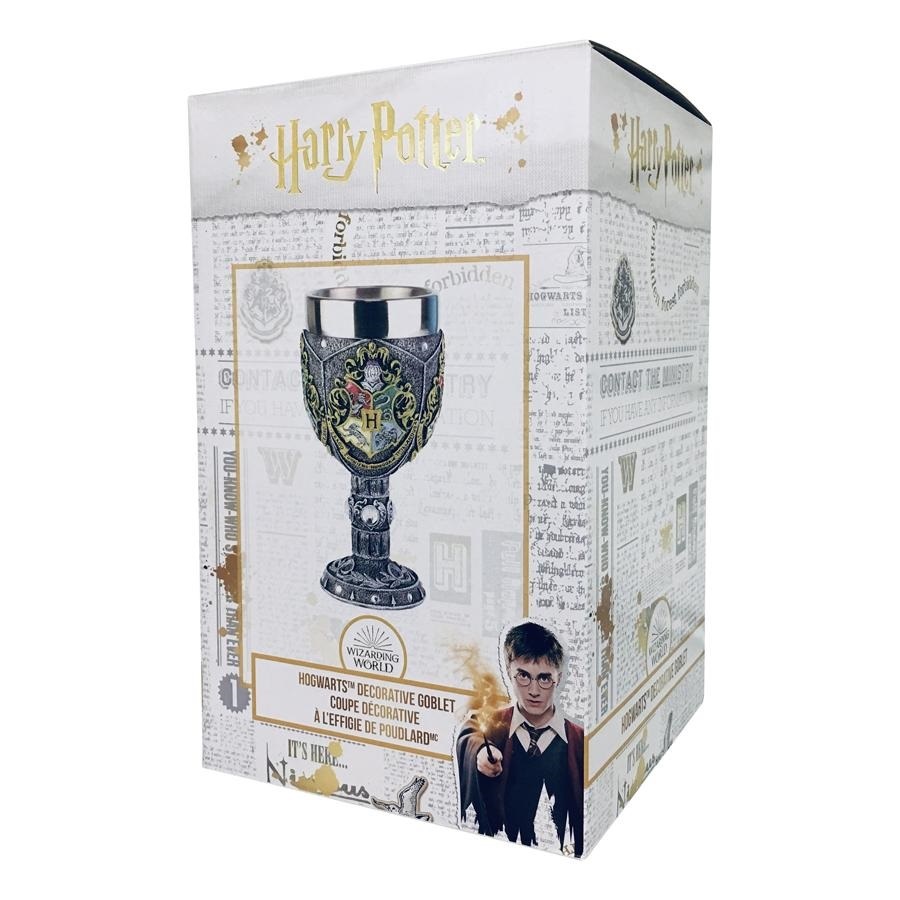 This is a 7.09″ high x 3.64″ x 3.65″ sculpted stone resin with stainless steel bowl and lip decorative goblet. Founded by the four greatest wizards of their time, Hogwarts School of Witchcraft and Wizardry has long been the pinnacle of magical learning. Show your school spirit with this elegant 10 oz decor goblet. This is hand-painted with clear faceted faux gemstones and featuring the Hogwarts School heraldic emblem in bas relief with the symbols of the four Houses. This is a decorative Goblet, not Intended as Drinkware. Hand-wash stainless steel bowl only. It is new and unused and is stored in a smoke and pet free environment.