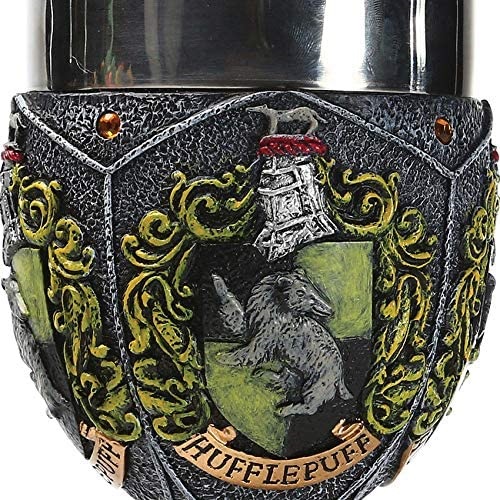 This is a 7.09″ high x 3.64″ x 3.65″ sculpted stone resin with stainless steel bowl and lip decorative goblet. Symbolized by the badger, Helga Hufflepuff accepted and welcomed witches and wizards of all kind, and her house made many misfits strong. Show your house loyalty with this elegant 10 oz decor goblet. This is hand-painted with clear faceted faux gemstones and featuring the Hufflepuff heraldic emblem in bas relief. This is a decorative Goblet, not Intended as Drinkware. Hand-wash stainless steel bowl only. It is new and unused and is stored in a smoke and pet free environment.
