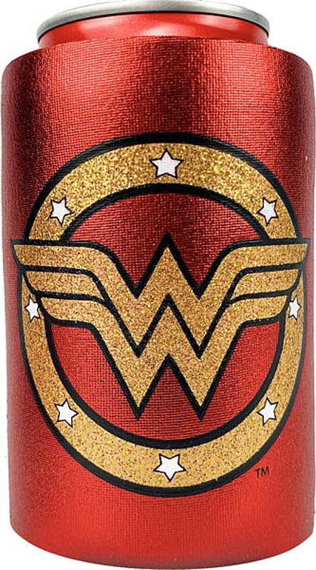 This is an illustrated can cooler with sparkles featuring the WW logo in gold of DC Comics Wonder Woman on a red background. Spot Clean recommended. It is a new and unused can cooler huggie koozie stored in a smoke and pet free environment.