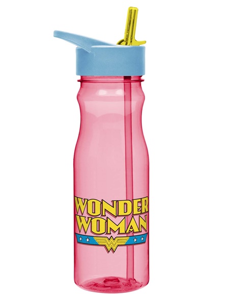 Produced in 2014 this is a 25 ounce plastic Tritan travel water bottle with a screw on lid that has a sippy spout and a built in carrying loop and features Wonder Woman’s name and WW logo. This is new and unused measuring 9.5″ high and stored in a smoke and pet free environment.