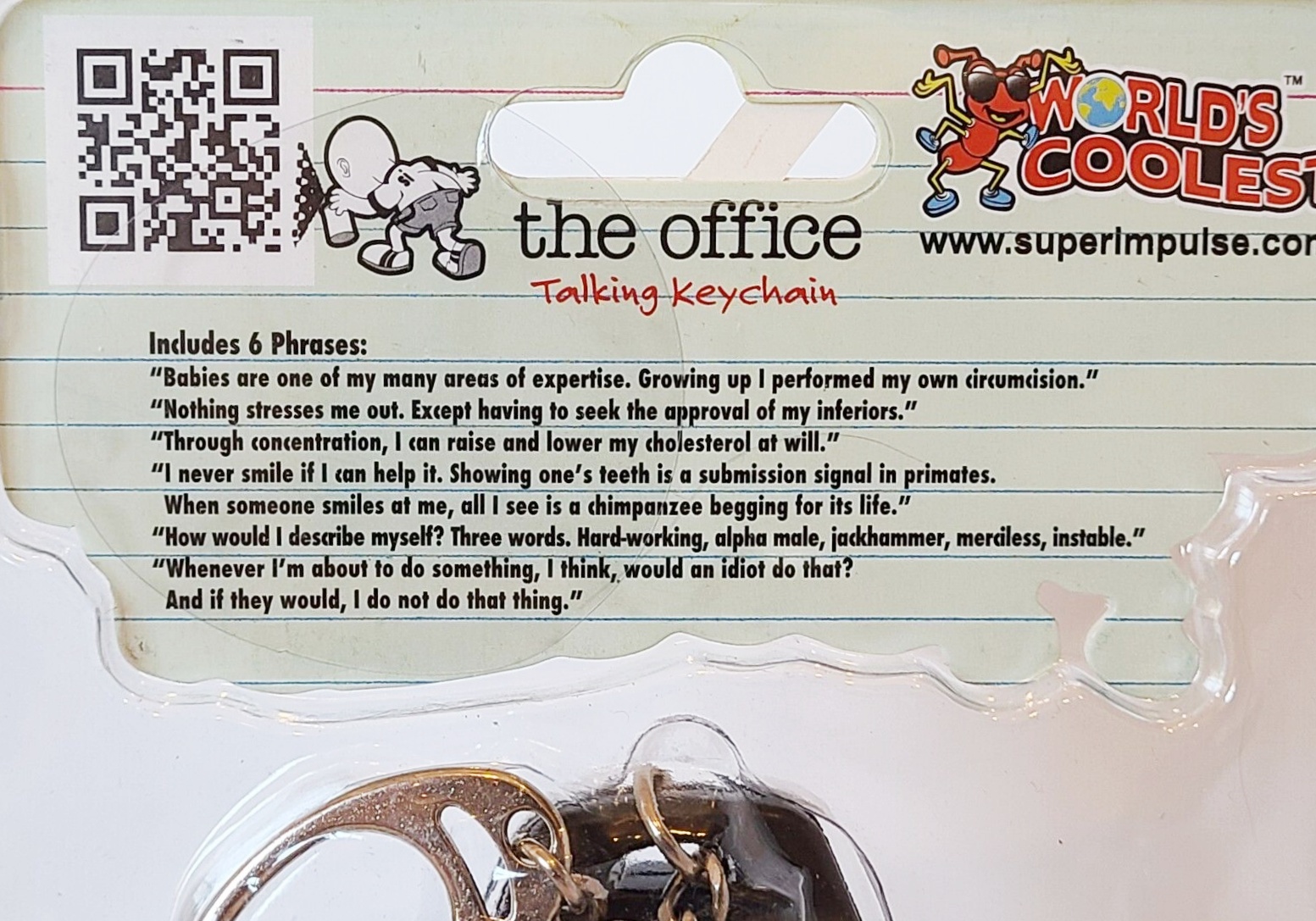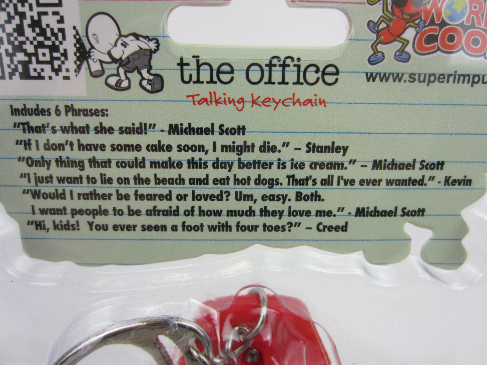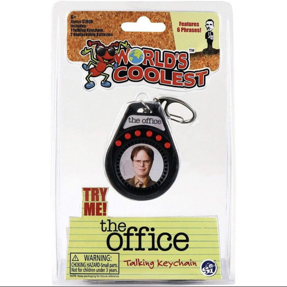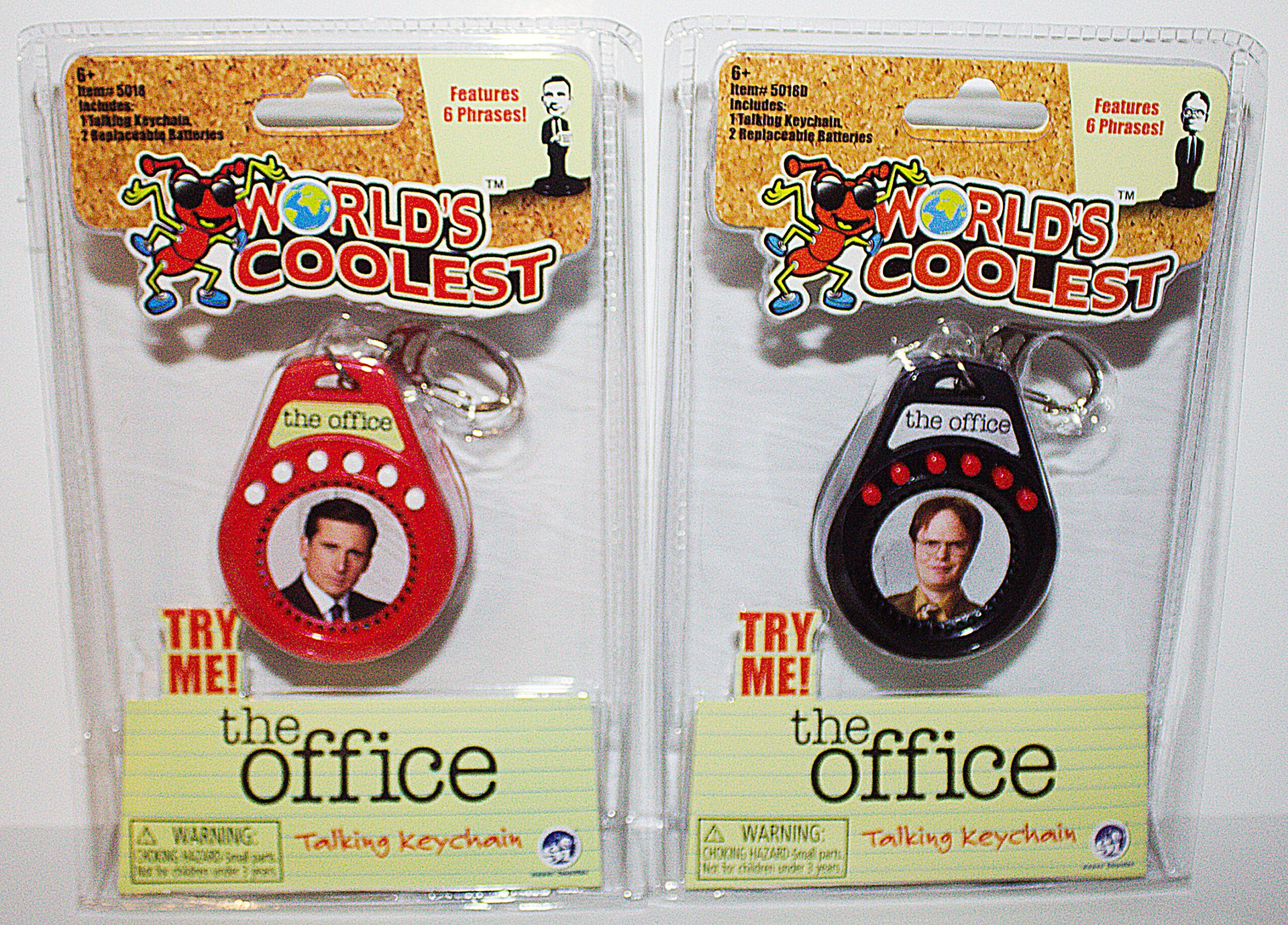 Produced by Super Impulse, this is part of their World’s Coolest line of toys. This features talking key chains of two of the main characters from the hit TV series The Office. They are Michael Scott and Dwight Schrute and are approximately 3″ tall and each includes 6 different recorded phrases from the the TV show. We pulled these from a sealed case that we bought direct from Super Impulse and they have been stored in a smoke and pet free environment.