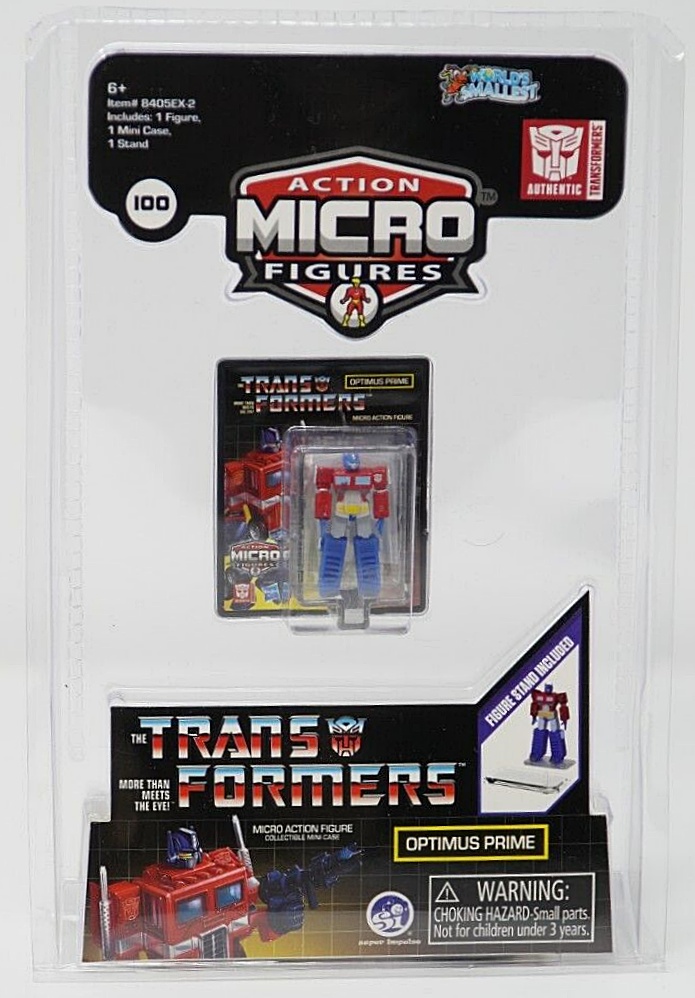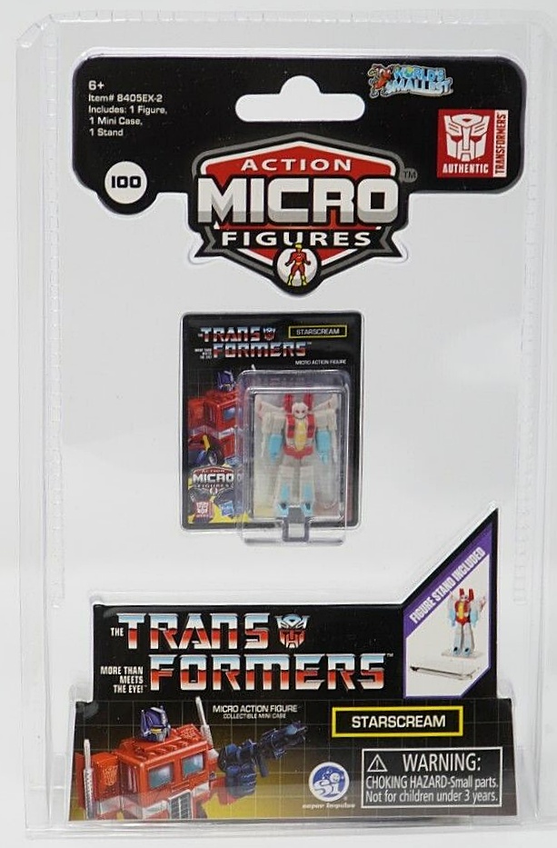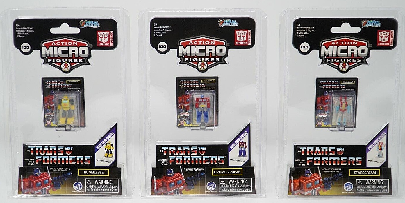 Produced by Super Impulse, this is part of their World’s Smallest line of toys. This features three different images from the popular animated and live action Transformers. They are Bumblebee, Optimus Prime and Starscream. The figures are approximately 1.25″ tall and include a stand and display box and transforms from robot to car and back. We pulled these from a sealed case that we bought direct from Super Impulse and they have been stored in a smoke and pet free environment.