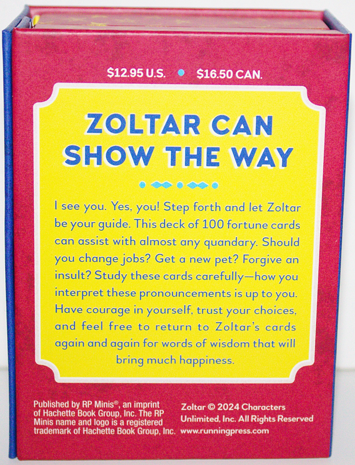 The iconic and animatronic mystic Zoltar offers words of wisdom to bring you much happiness with this wise and all-knowing fortune-telling card deck. The Deck contains 100 authentic mini fortune telling cards (3-1/2 x 2-1/2 inches) packaged in a deluxe keepsake box with a magnetic closure that is sturdy for continued use. The small size is perfect for travel and taking on the go and is a unique and fun gift for fans of Zoltar and mystics alike. An Authentic Zoltar collectible, this is a new, sealed copy that we purchased direct from the publisher and it has been stored in a smoke and pet free environment.